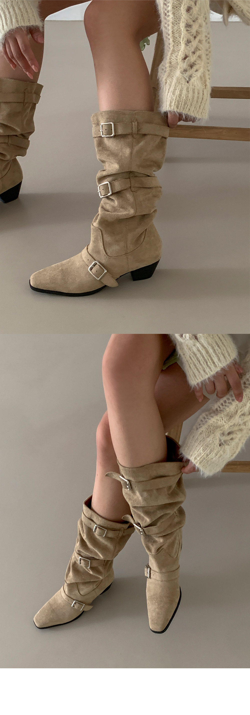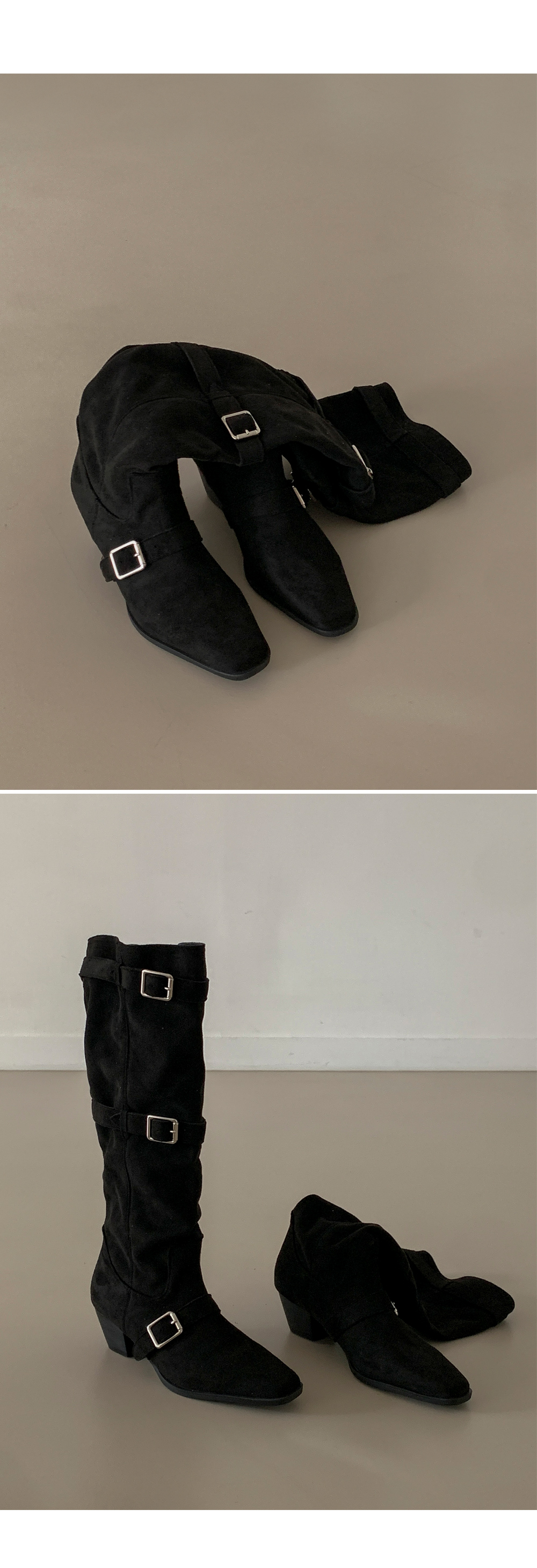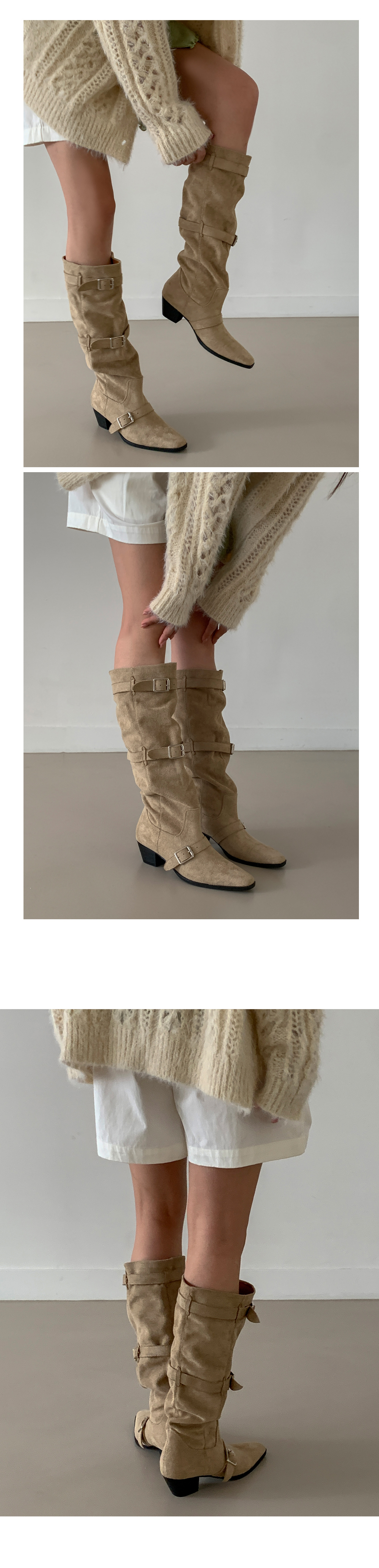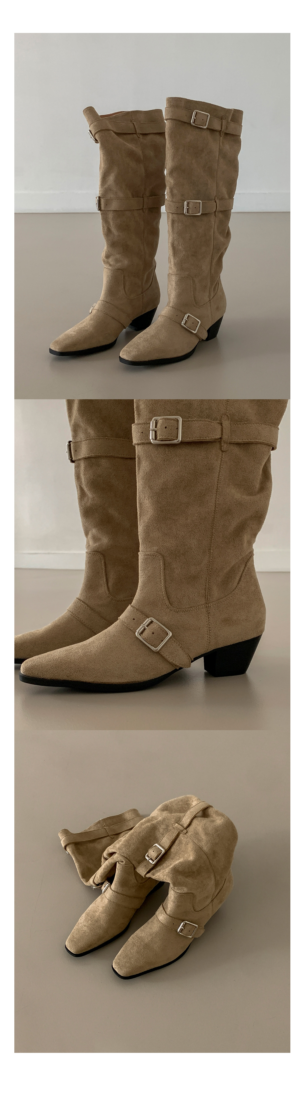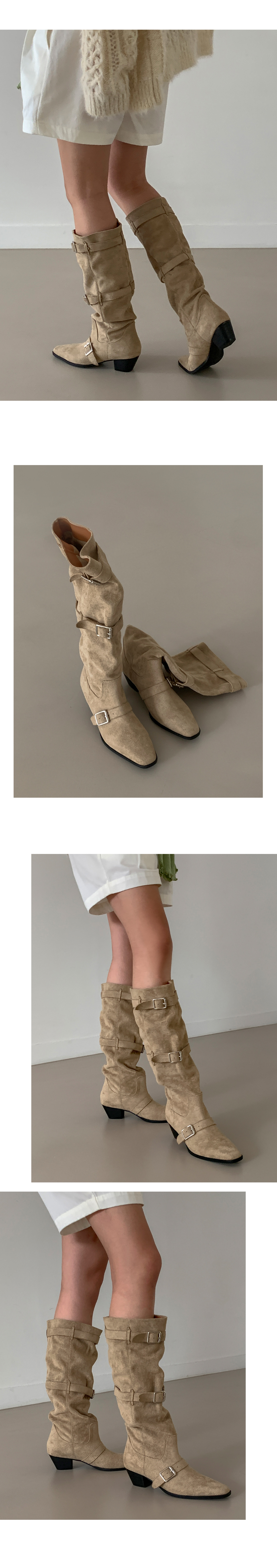 라엔 스웨이드 슬라우치 루즈핏 통굽 쓰리 버클 롱부츠