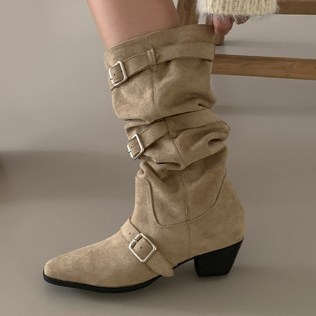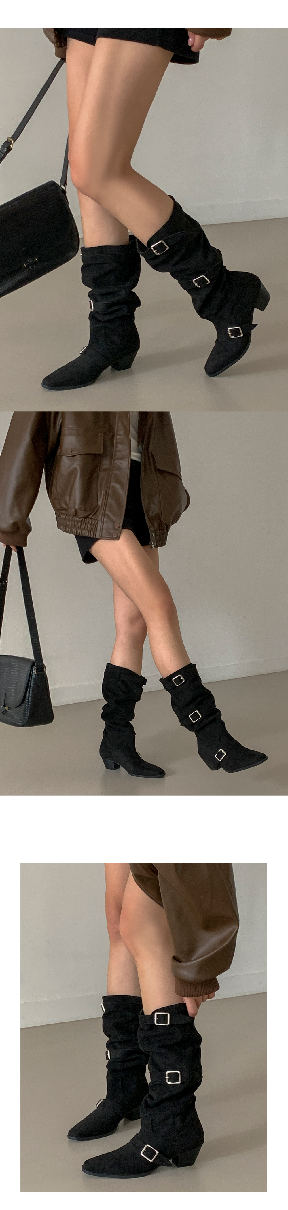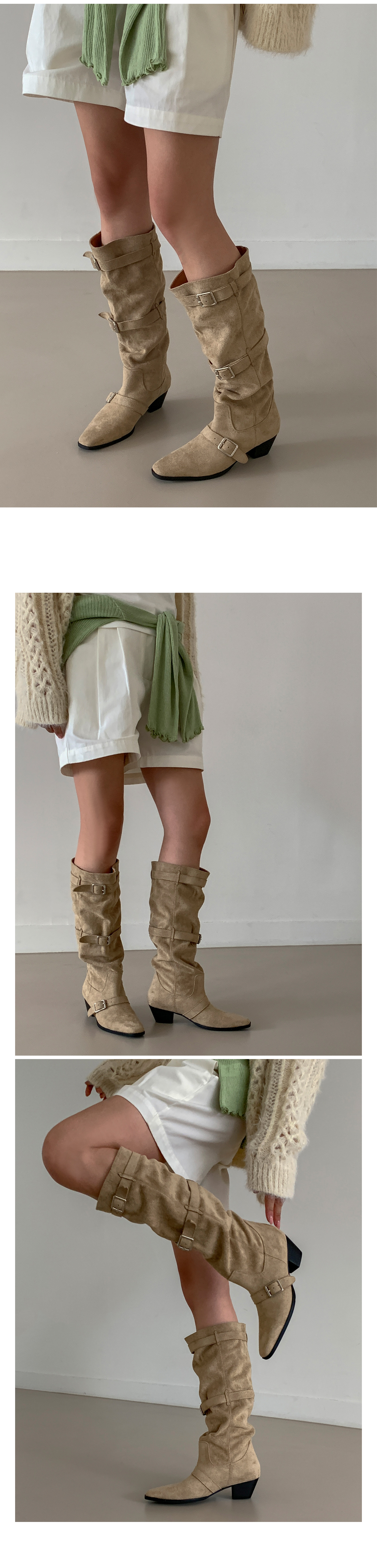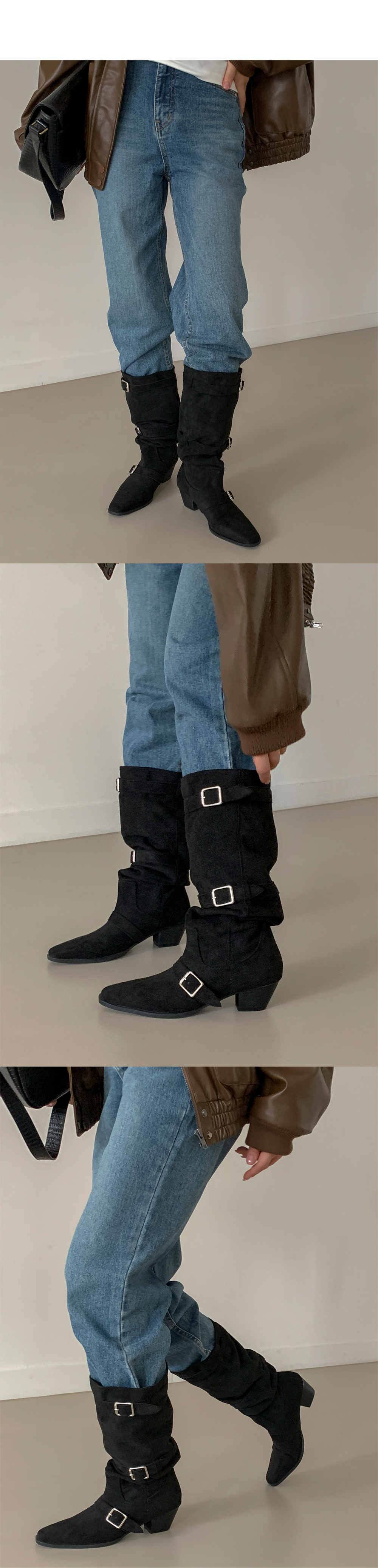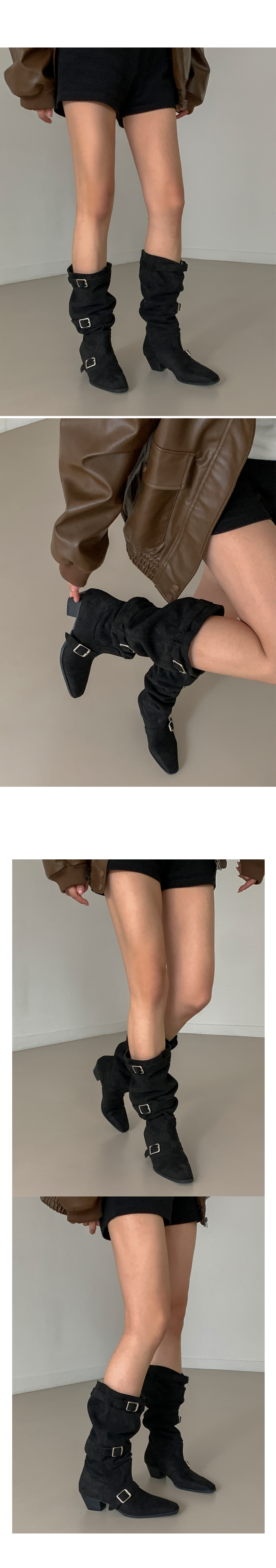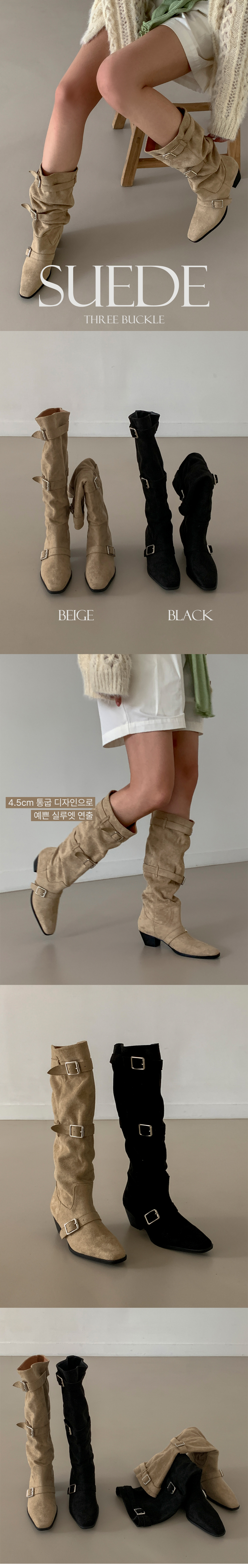 라엔 스웨이드 슬라우치 루즈핏 통굽 쓰리 버클 롱부츠