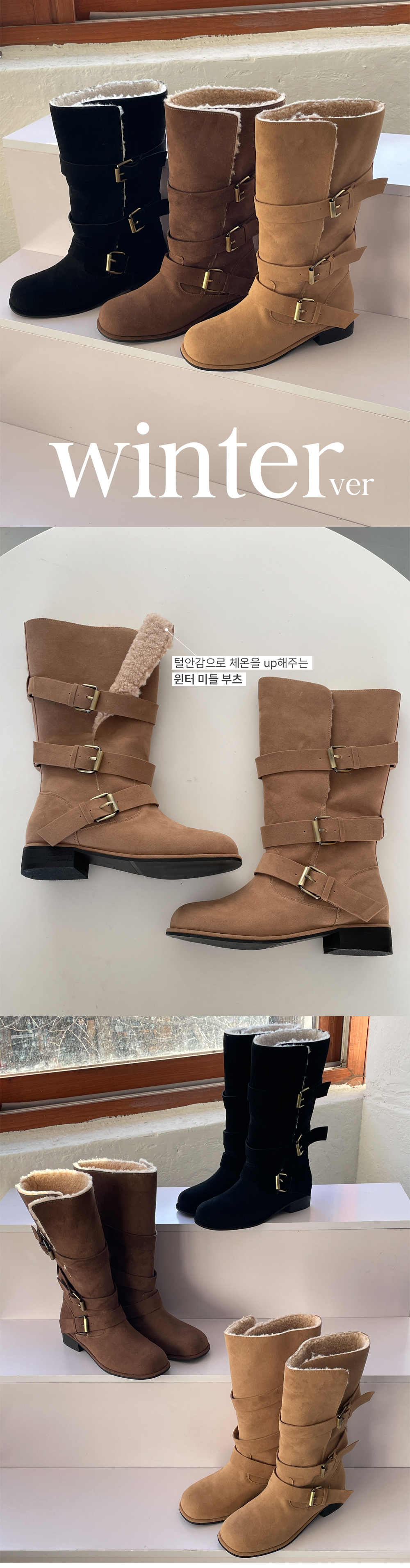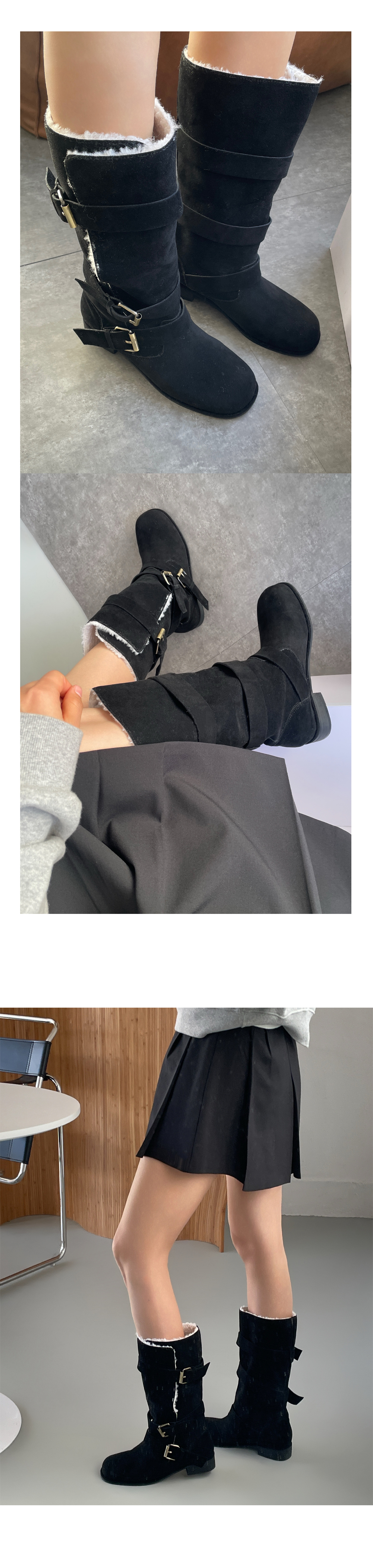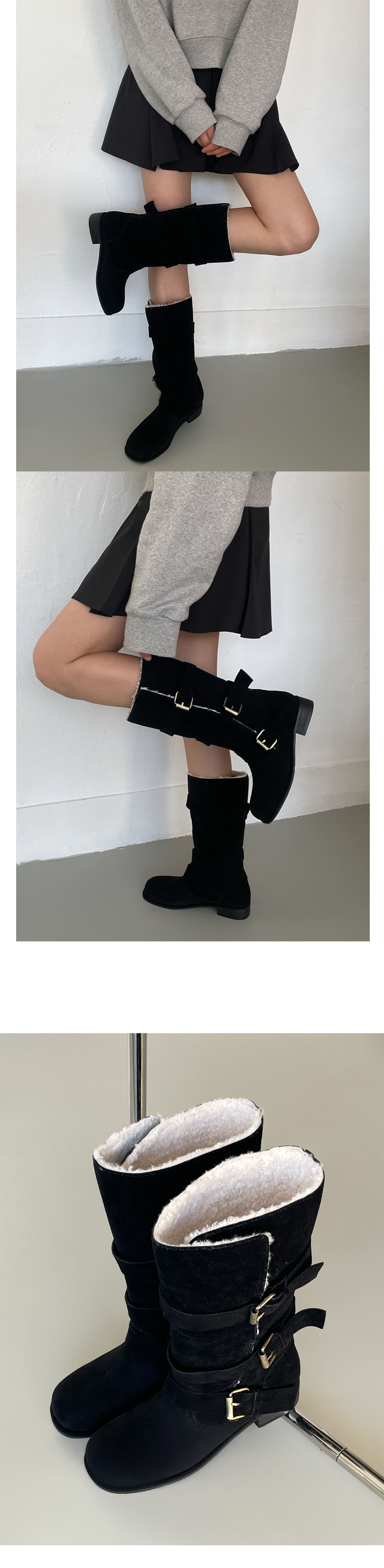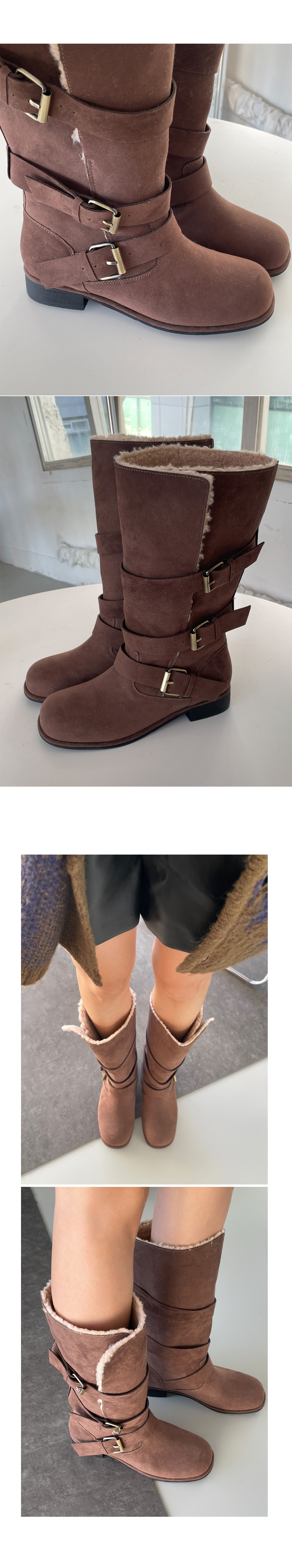 윈터 피어리 벨트 버클 스트랩 스웨이드 폴드 미들 부츠