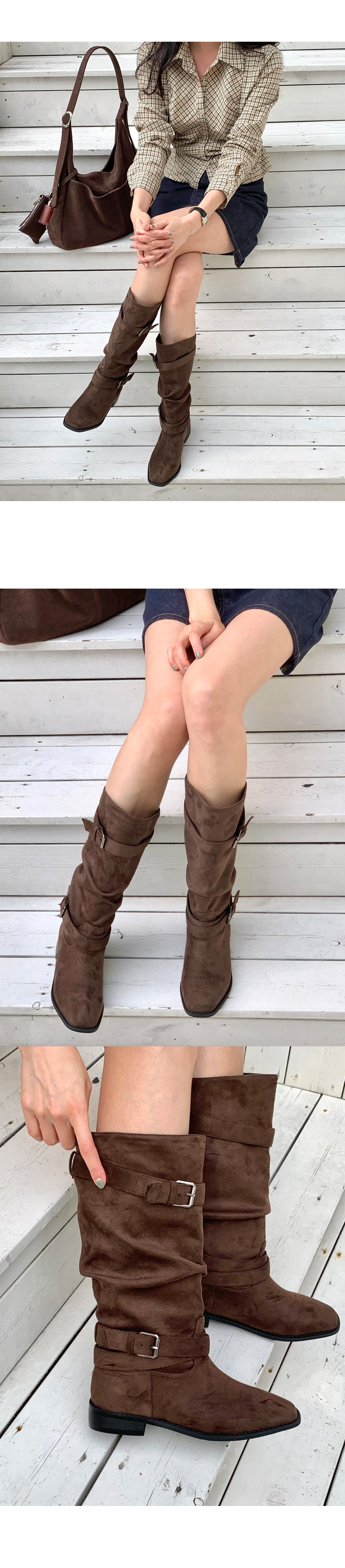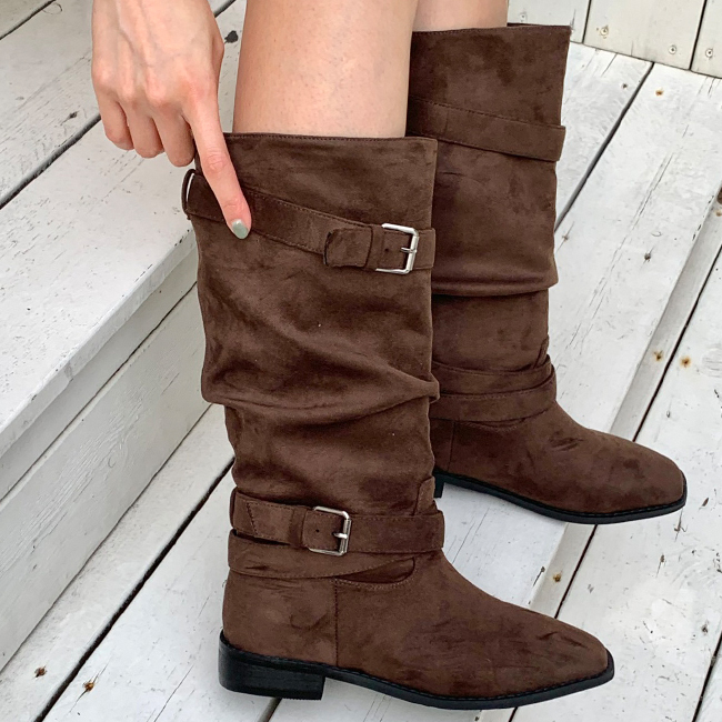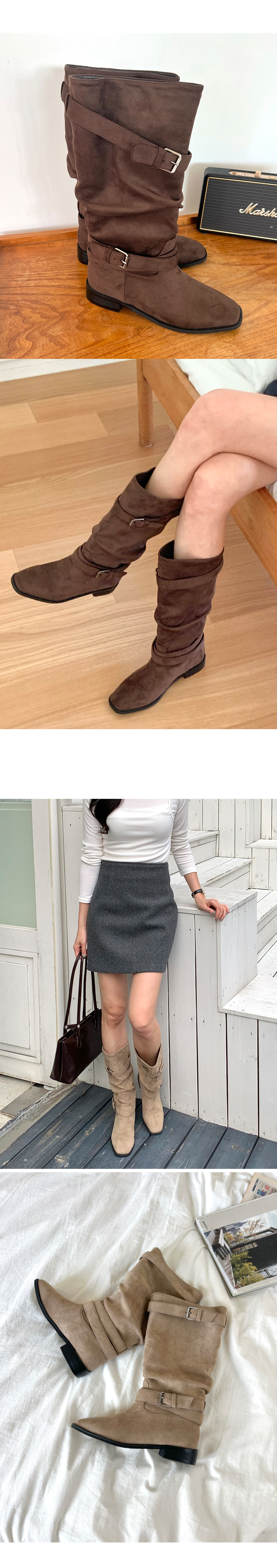 바흐렛 스웨이드 슬라우치 주름 루즈핏 통굽 버클 미들부츠