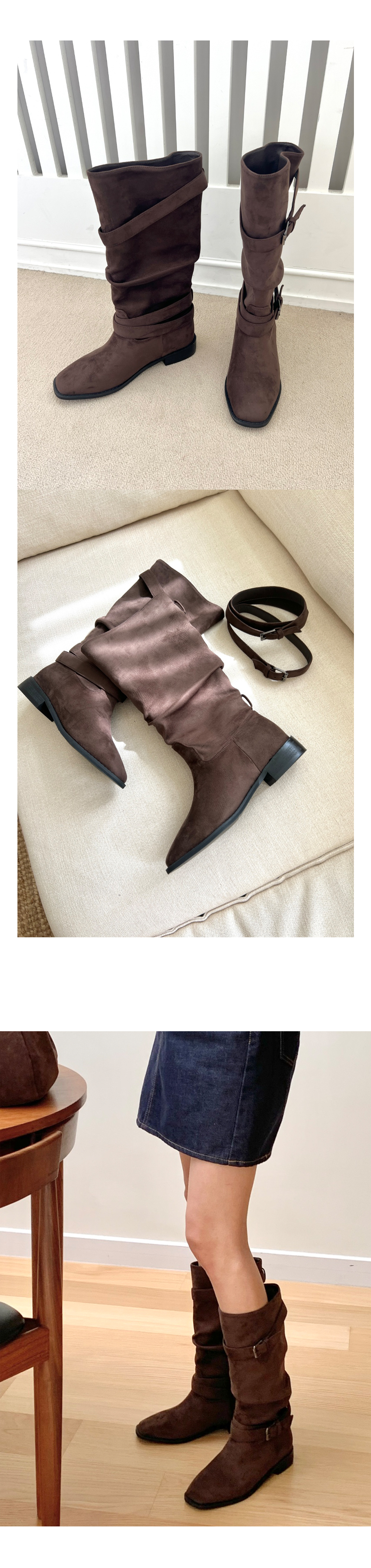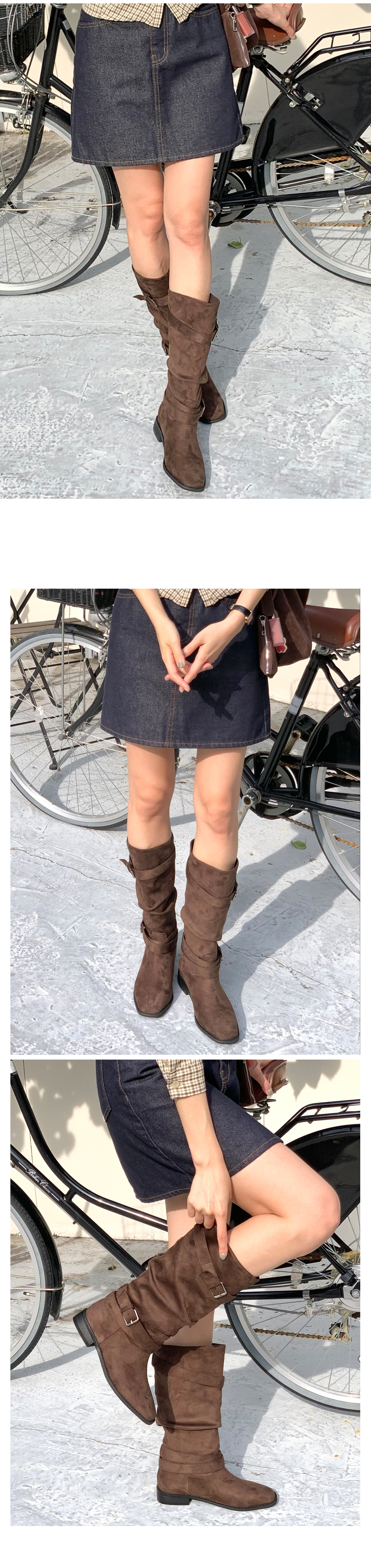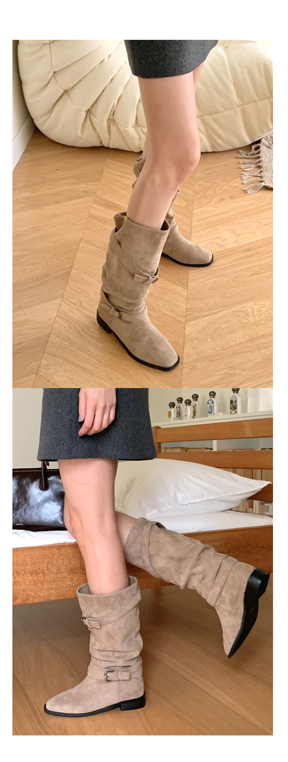 바흐렛 스웨이드 슬라우치 주름 루즈핏 통굽 버클 미들부츠