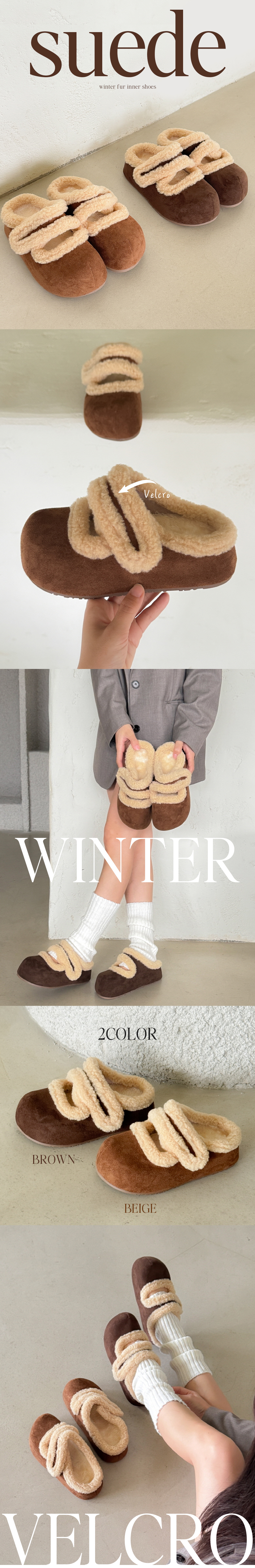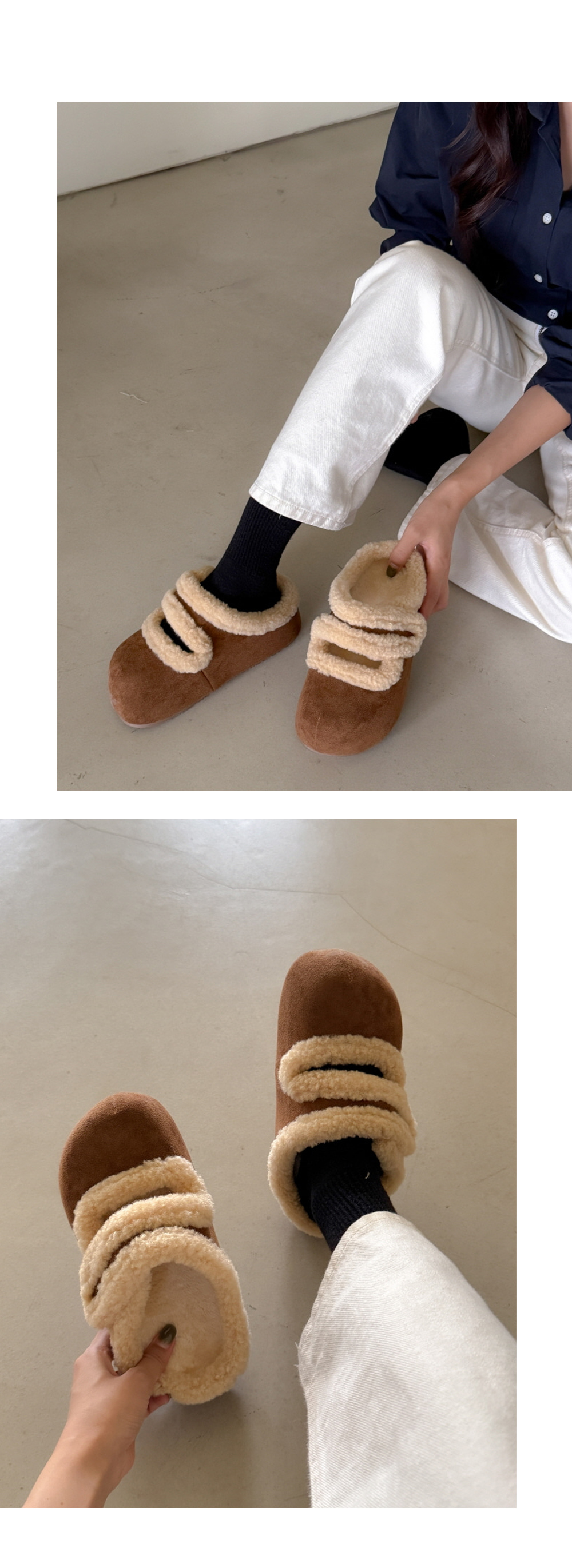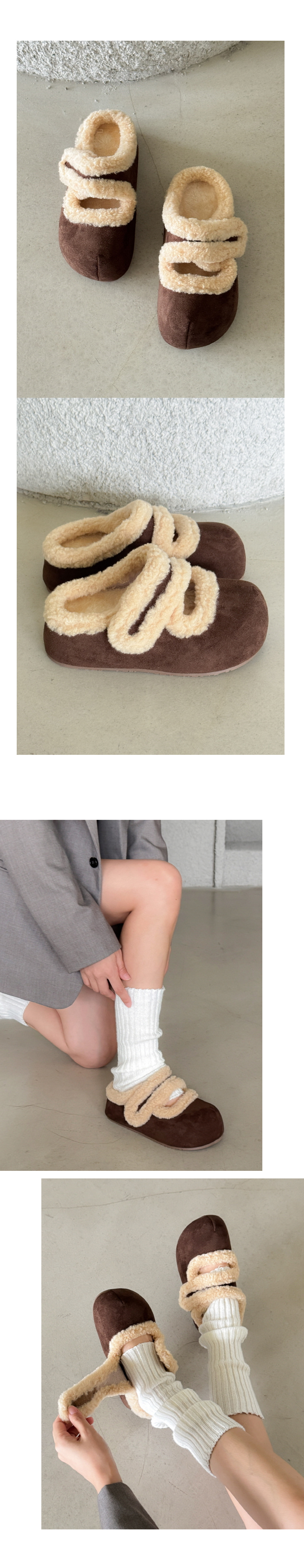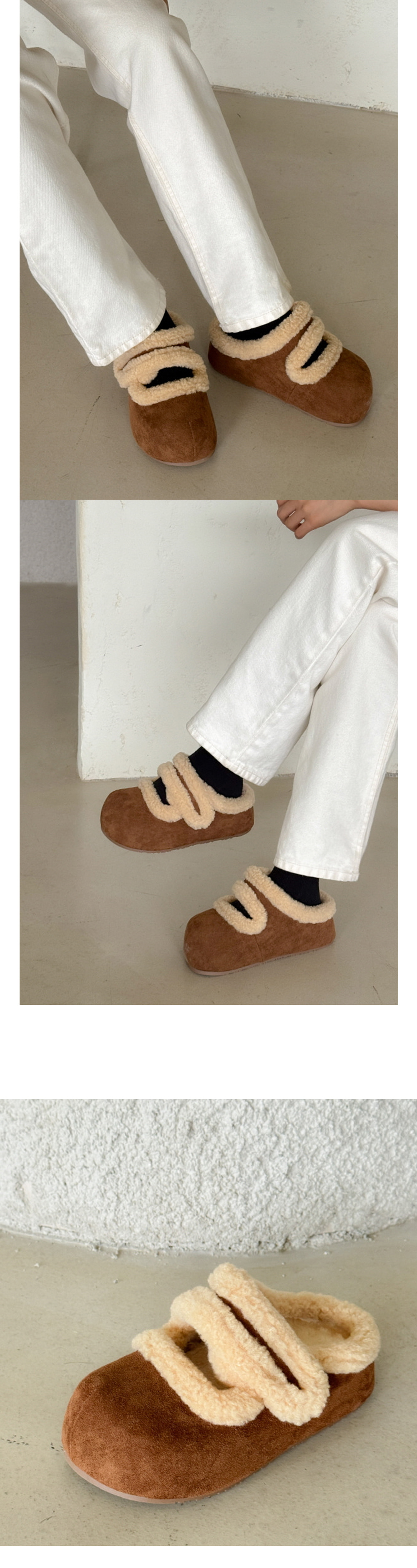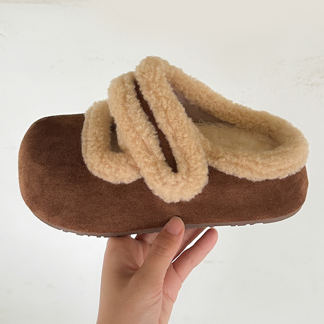 우아 어글리 스웨이드 벨크로 메리제인 통굽 털단화 슬리퍼