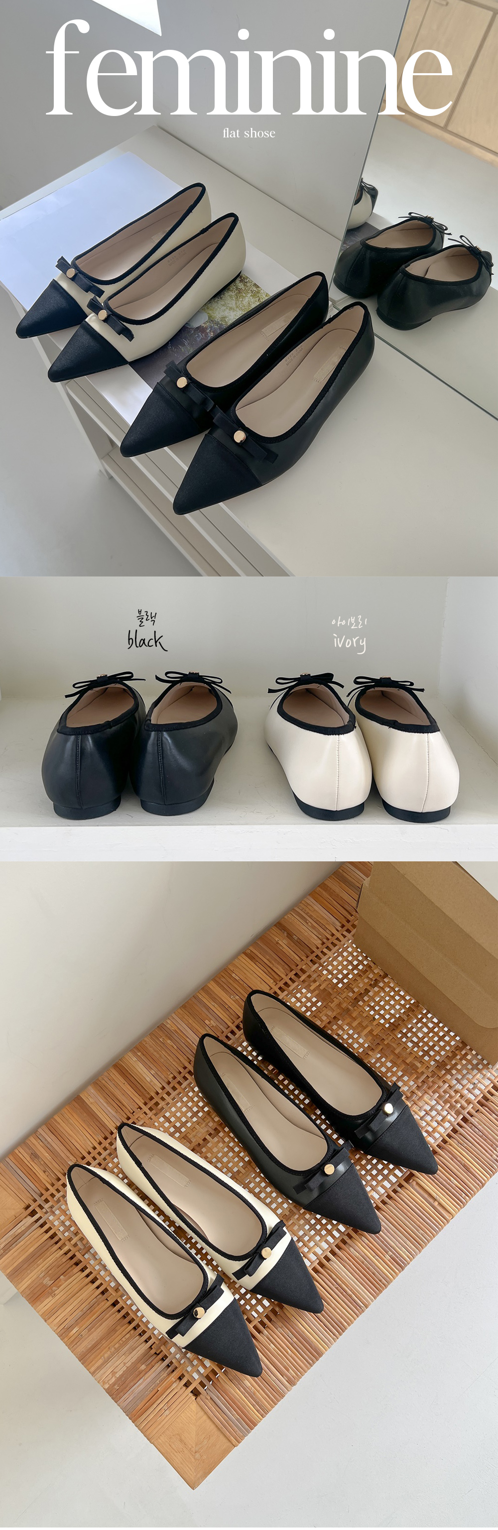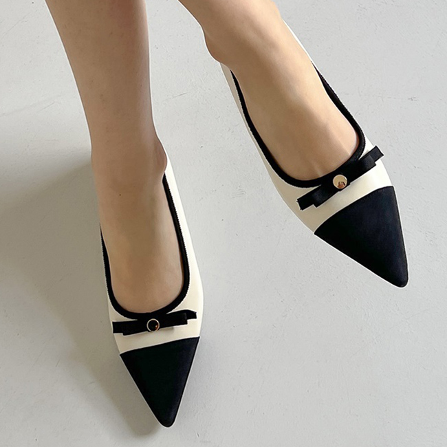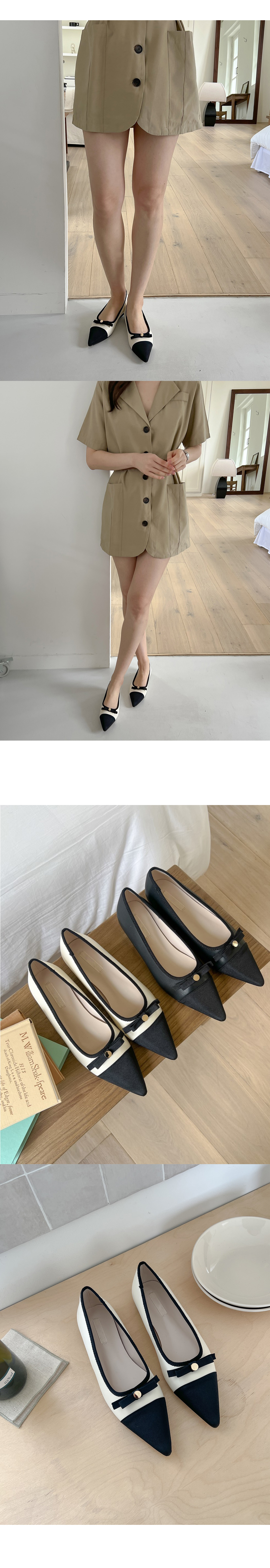 케플린 스틸레토 콤비 투톤 골드 버튼 리본 플랫슈즈