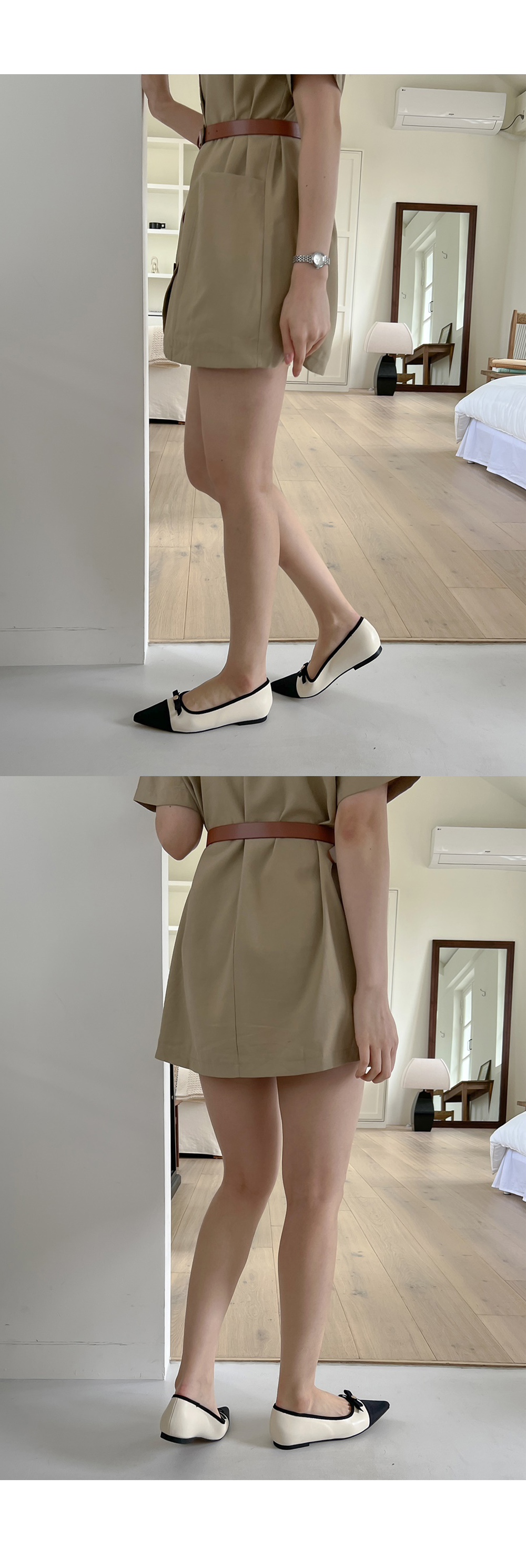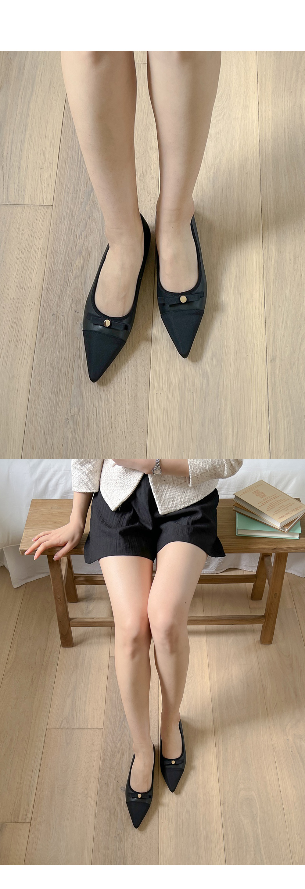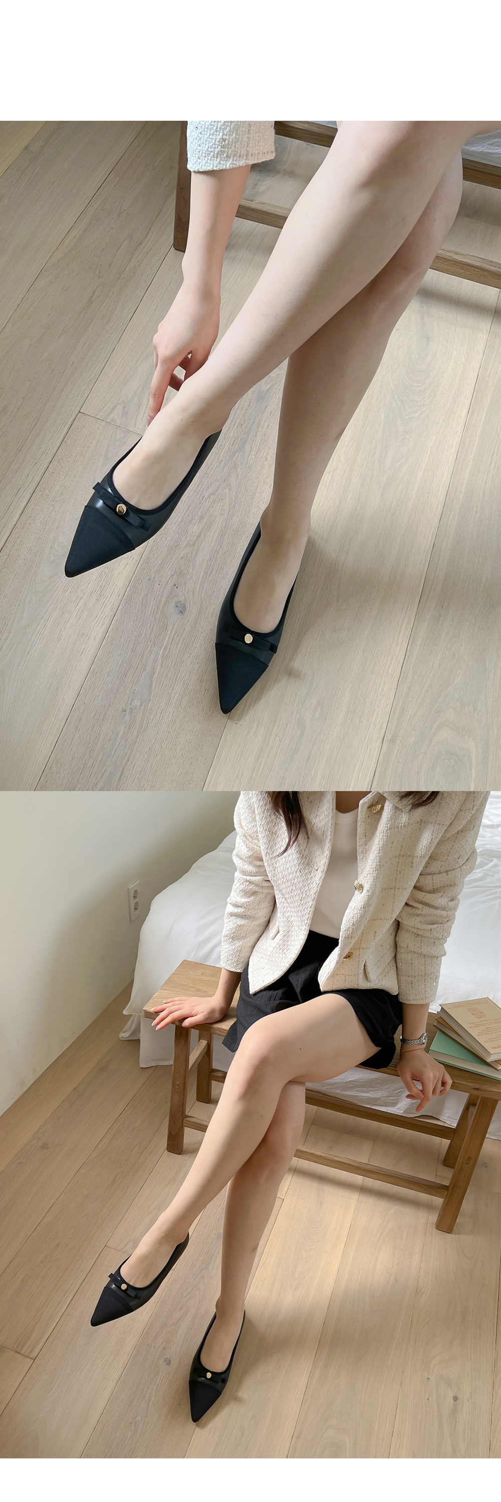 케플린 스틸레토 콤비 투톤 골드 버튼 리본 플랫슈즈