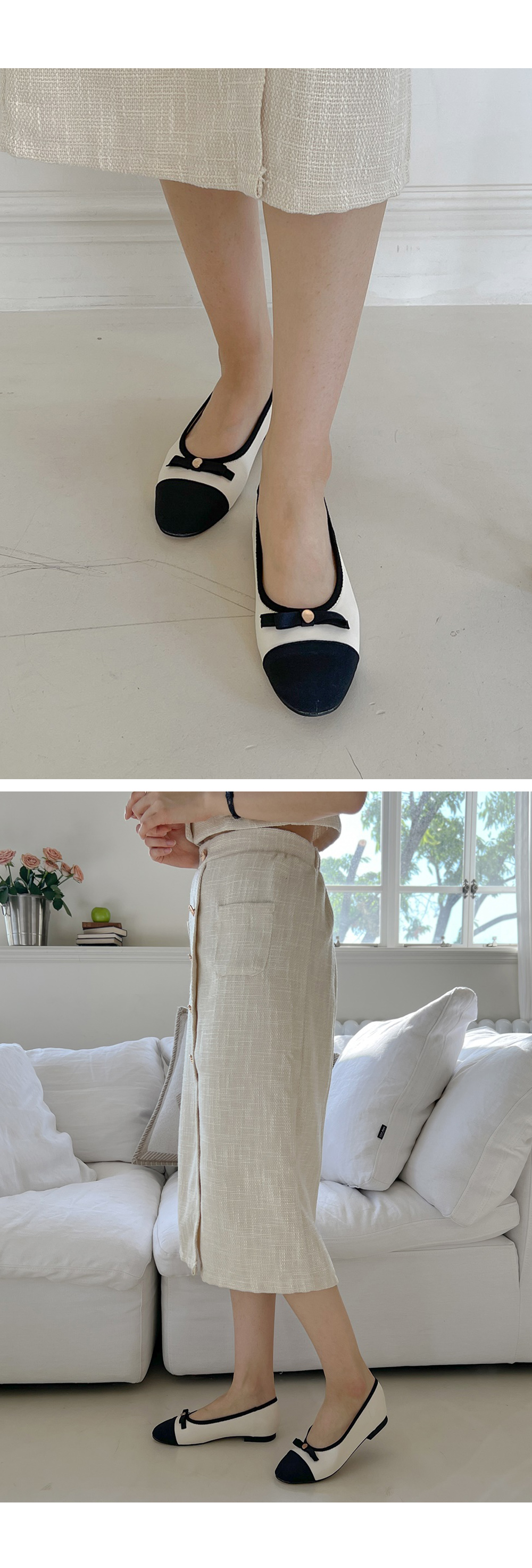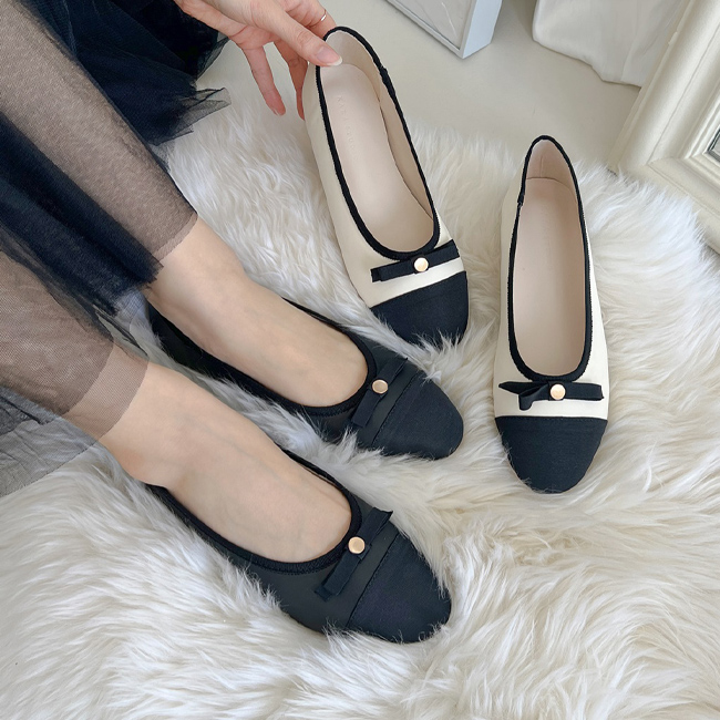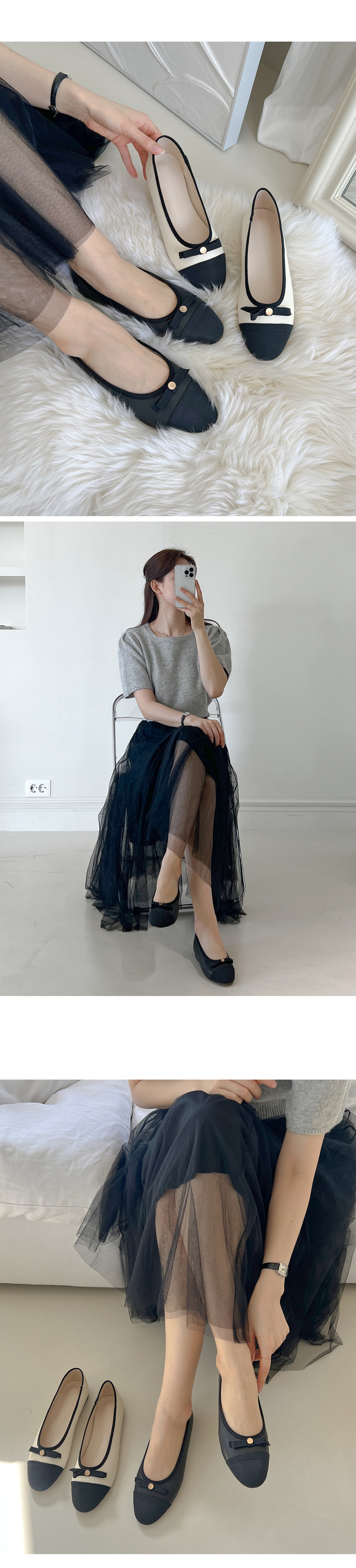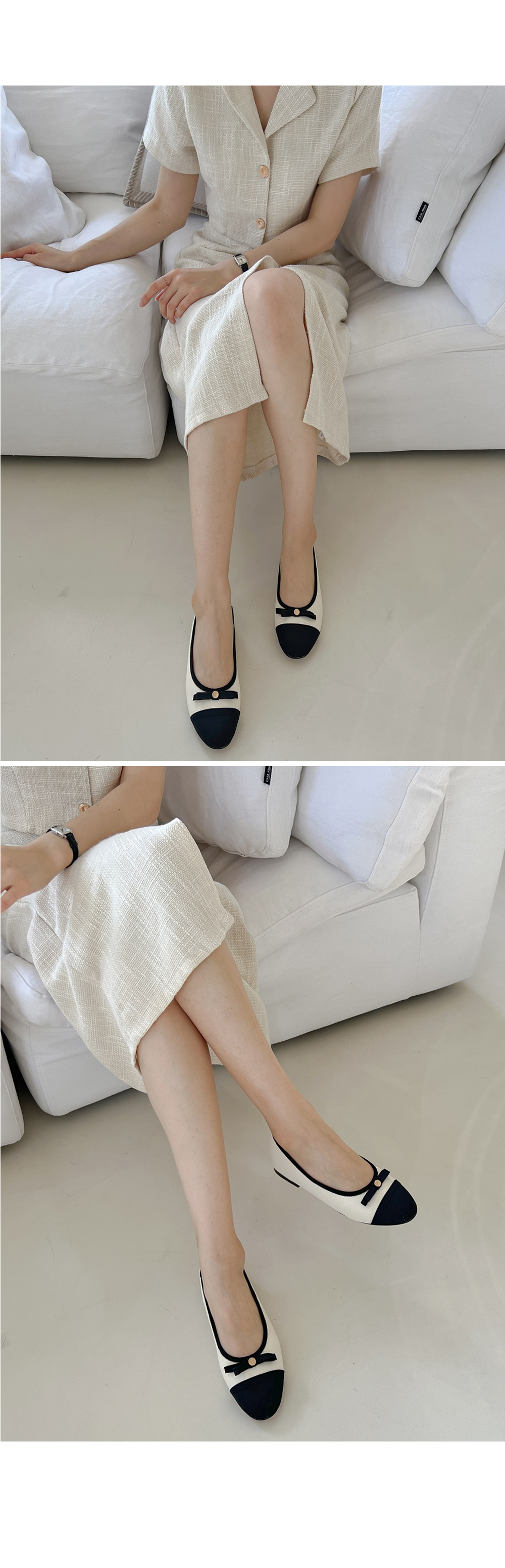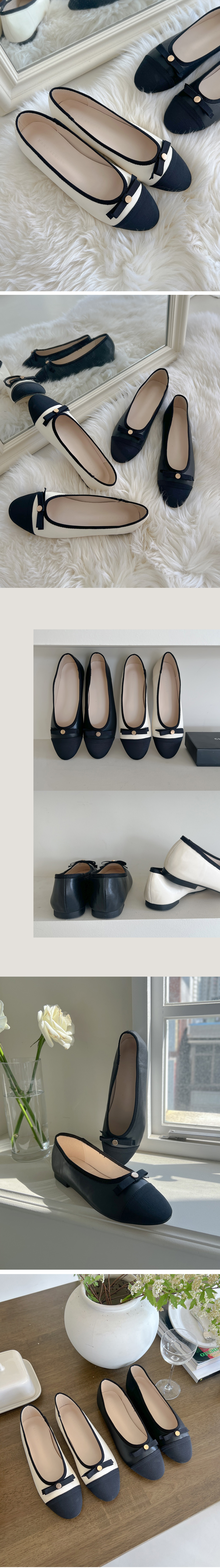 모니아 콤비 투톤 골드버튼 리본 플랫슈즈