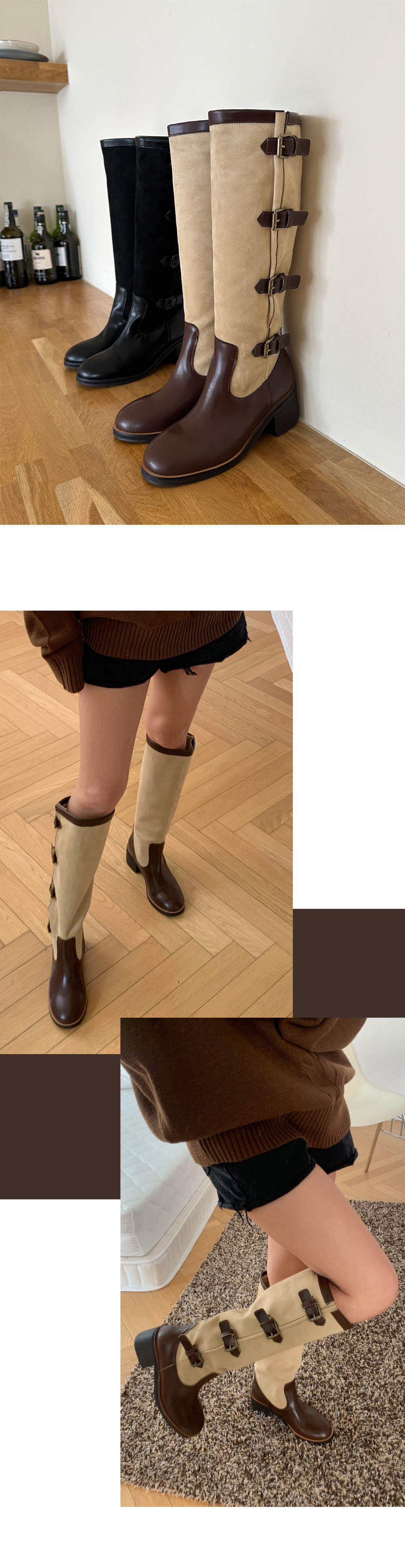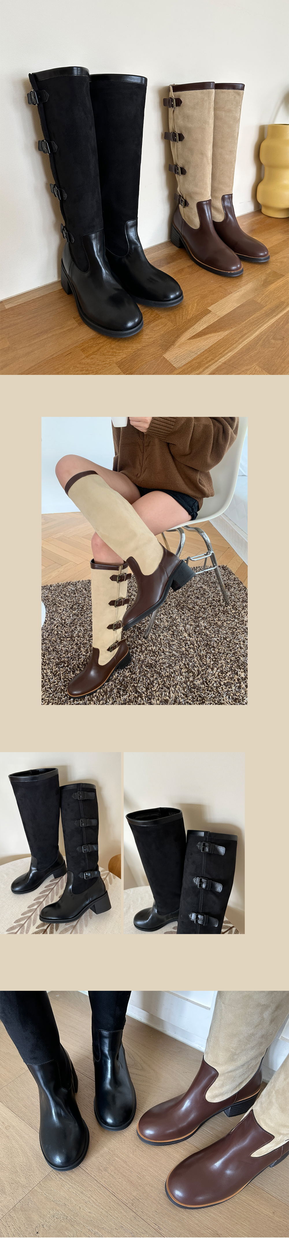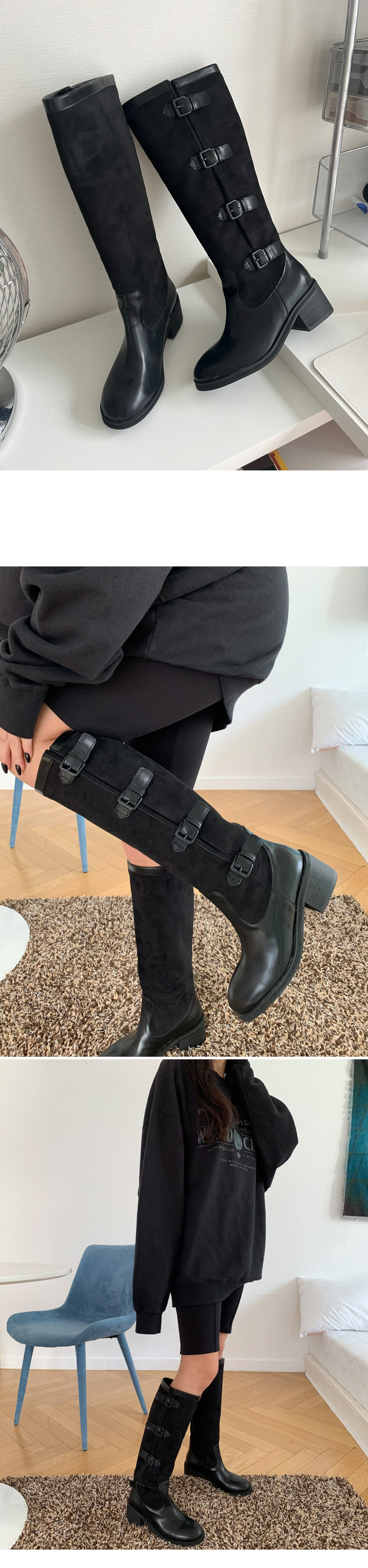 레이어드 버클 벨트 스트랩 투톤 니하이 롱부츠