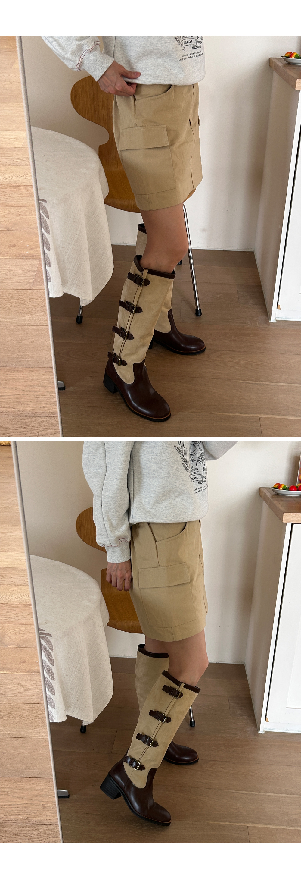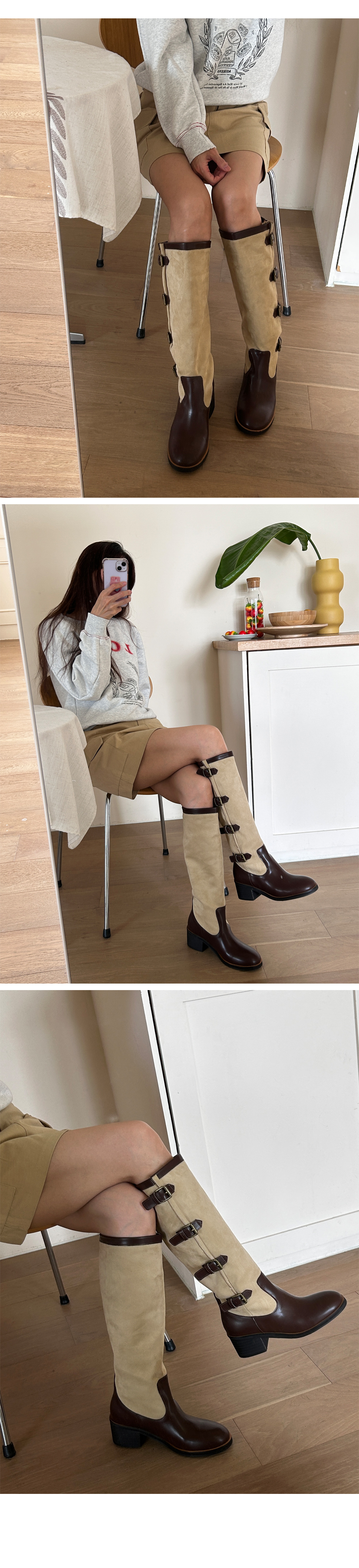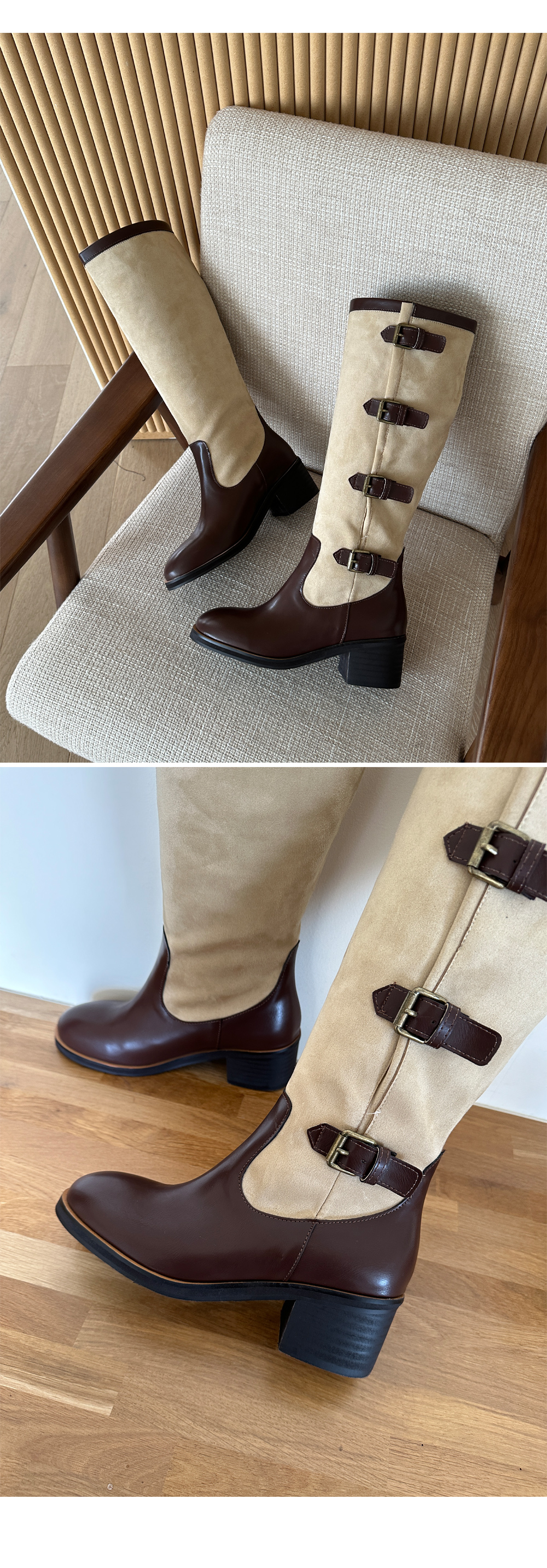 레이어드 버클 벨트 스트랩 투톤 니하이 롱부츠