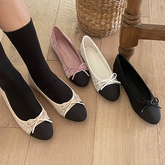 무아 콤비 투톤 둥근코 트위드 리본 플랫슈즈