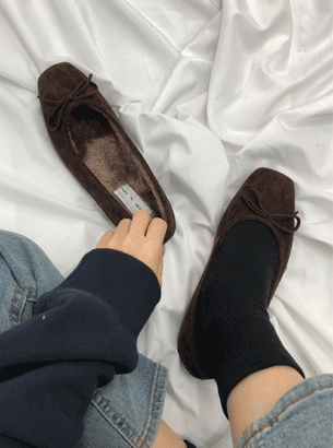 스웨이드 털안감 각코 리본 퍼 플랫슈즈 (1cm)