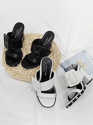 스터드 버클 와이드 스트랩 통굽 뮬 슬리퍼 힐 (9cm)