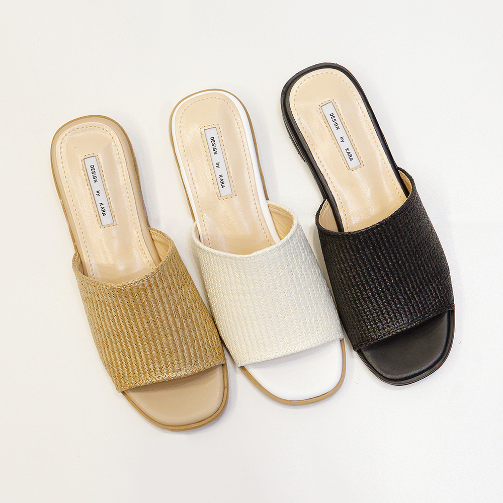 와이드한 라탄 스트랩이 발등을 잡아주는 슬리퍼 디자인으로