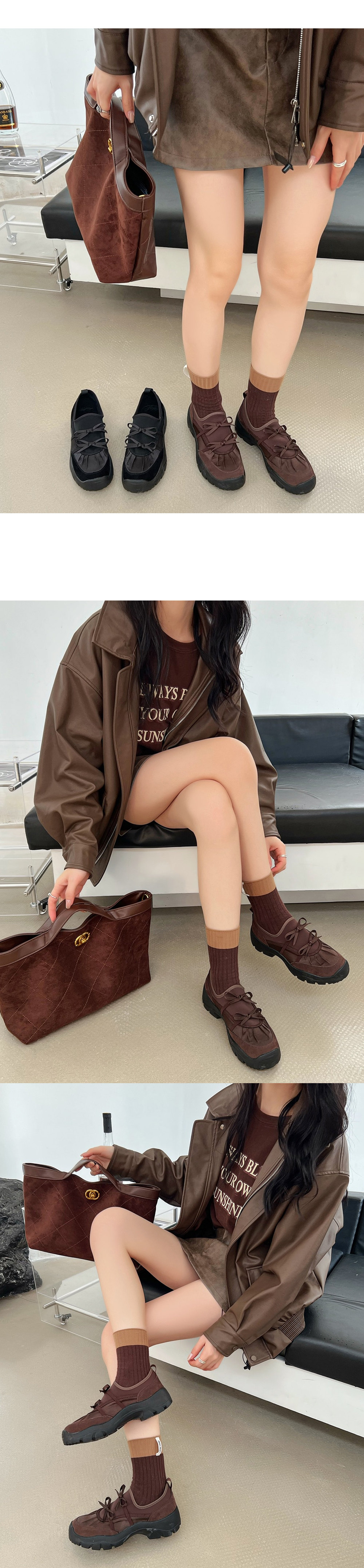 스웨이드와 세틴 소재로 콤비 효과를 주어 고급스러운 무드는 물론