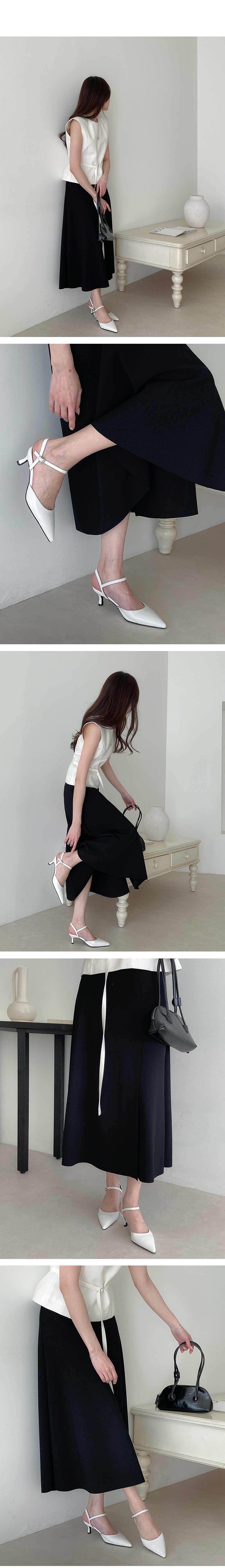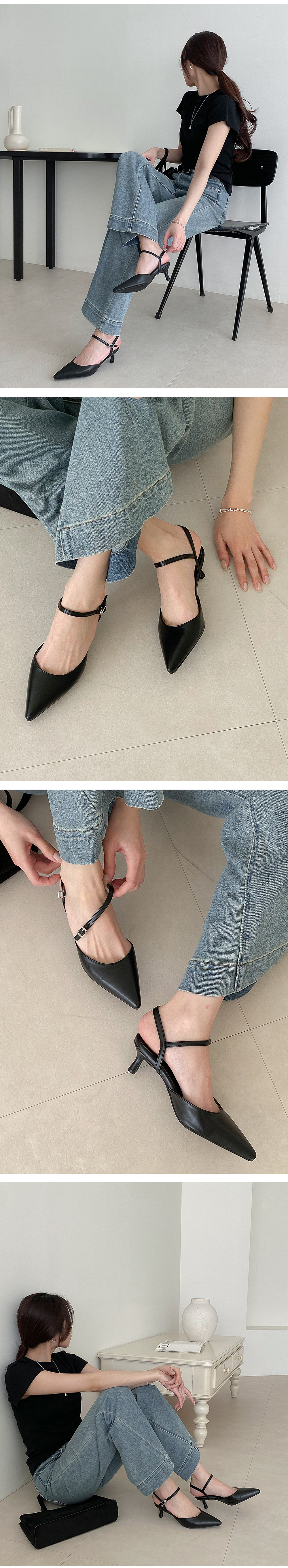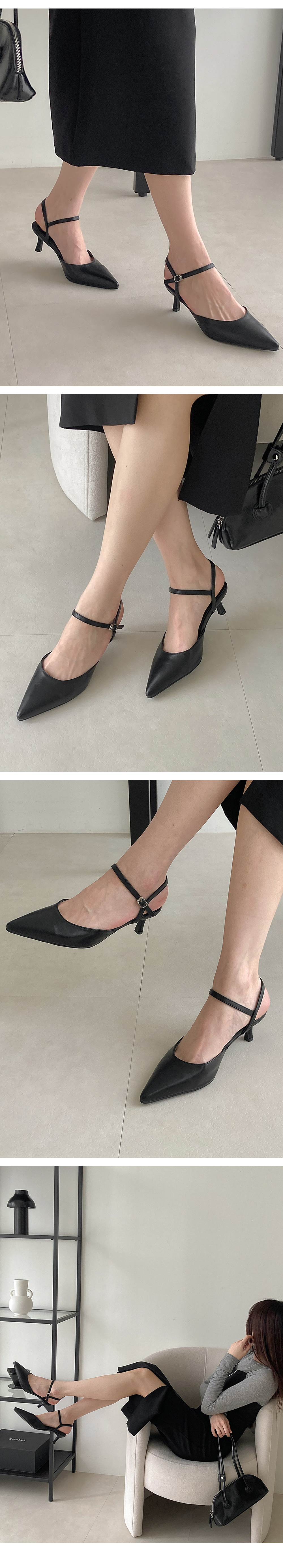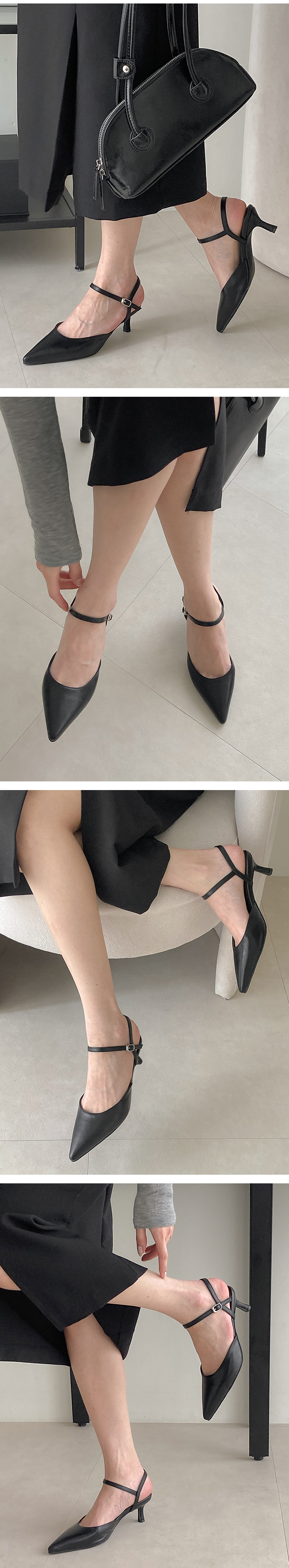 스틸레토 쉐입에 발목을 감싸주는 스트랩으로 마무리해 여성스러움이 물씬~